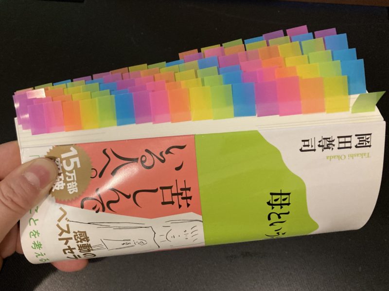 共感部分にマーカーを引いて付箋をはっていったら、付箋1冊では足らなくなってしまった。